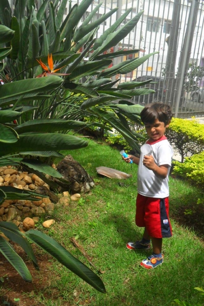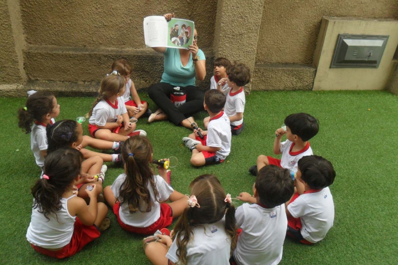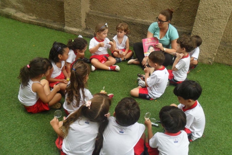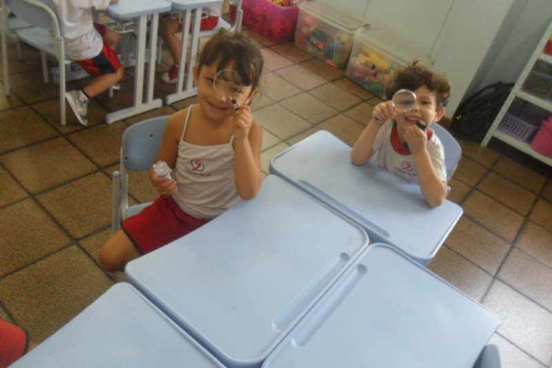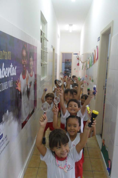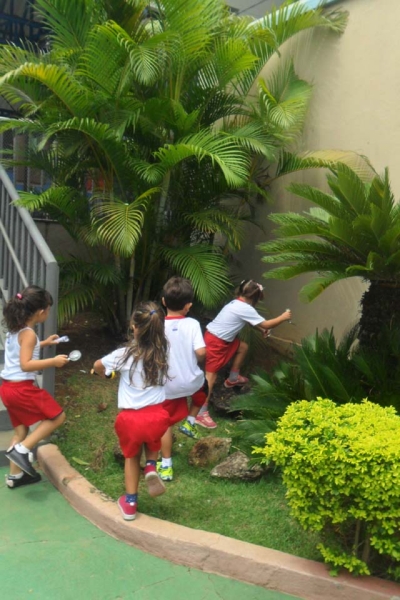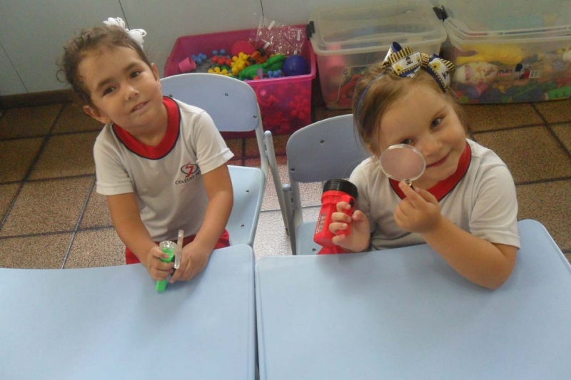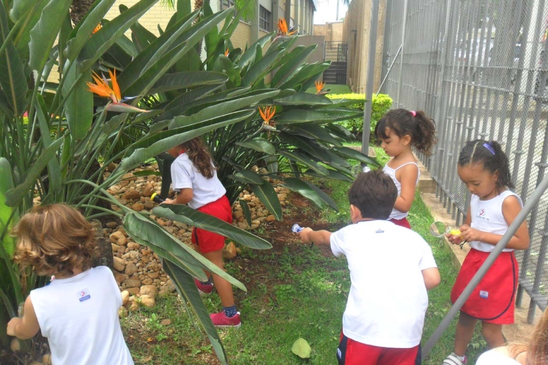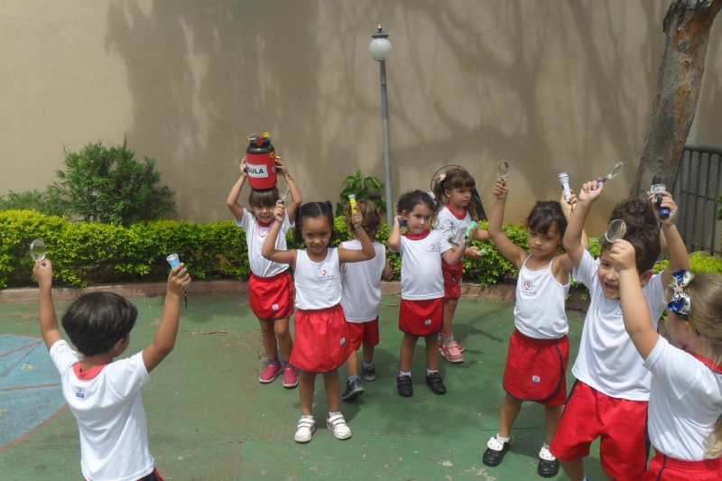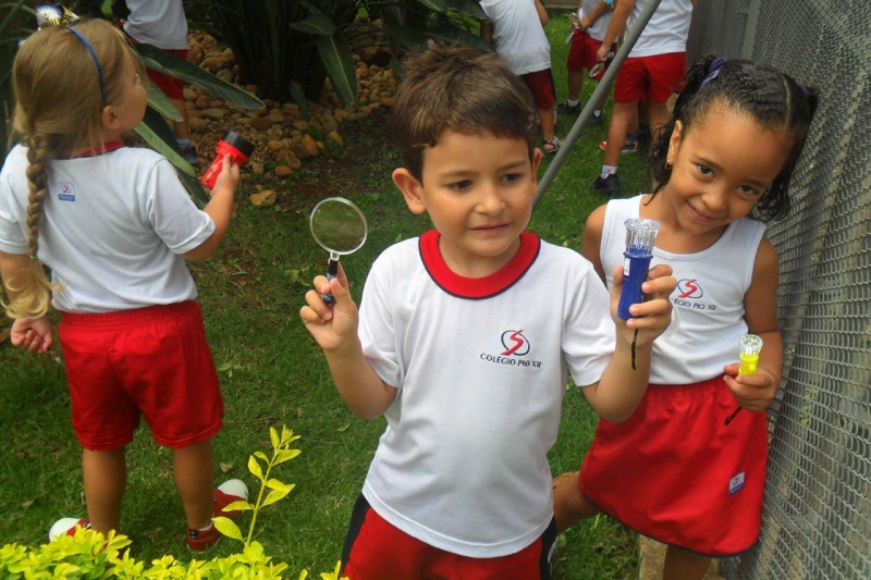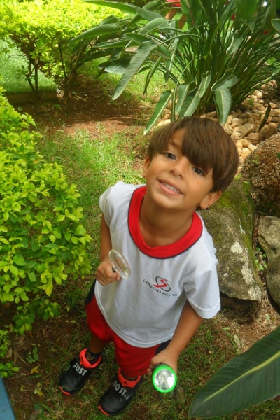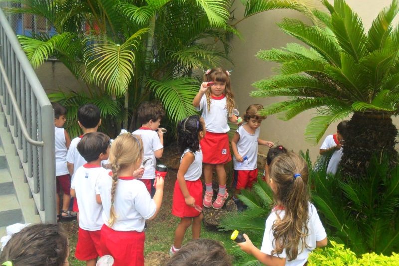 Com uma lupa e uma lanterna, os estudantes do Infantil II realizaram uma atividade inédita: encontraram no jardim do Colégio uma Cápsula do Tempo com cartas, músicas, estilos de roupas, fotos e recordações de Chiquinha Gonzaga.
