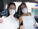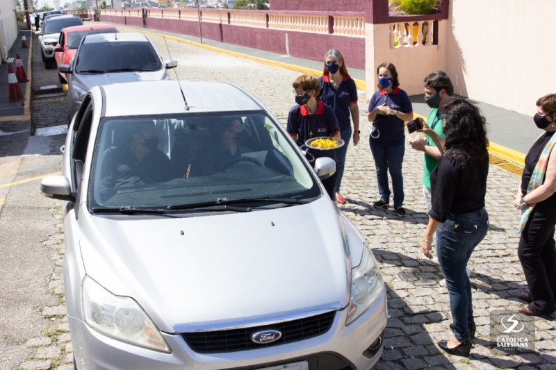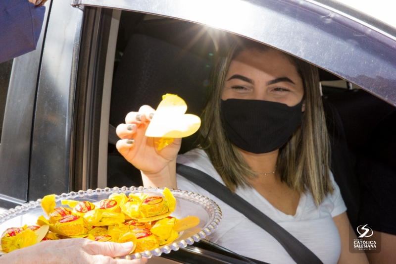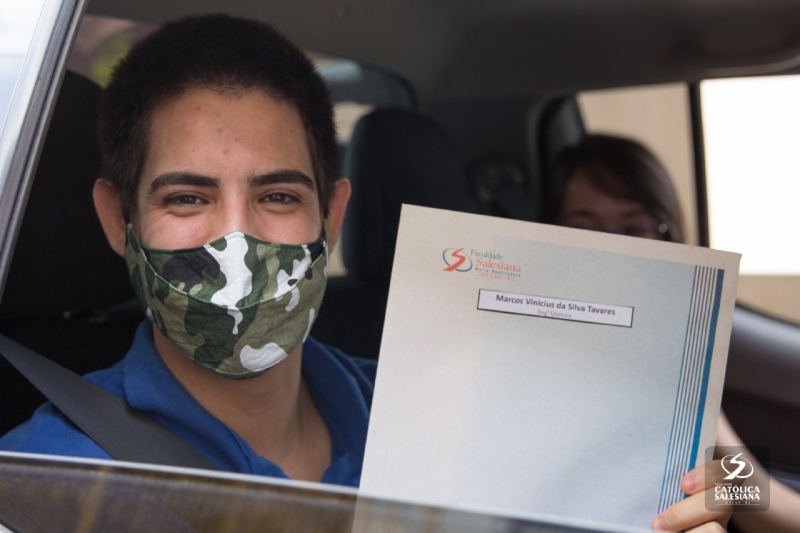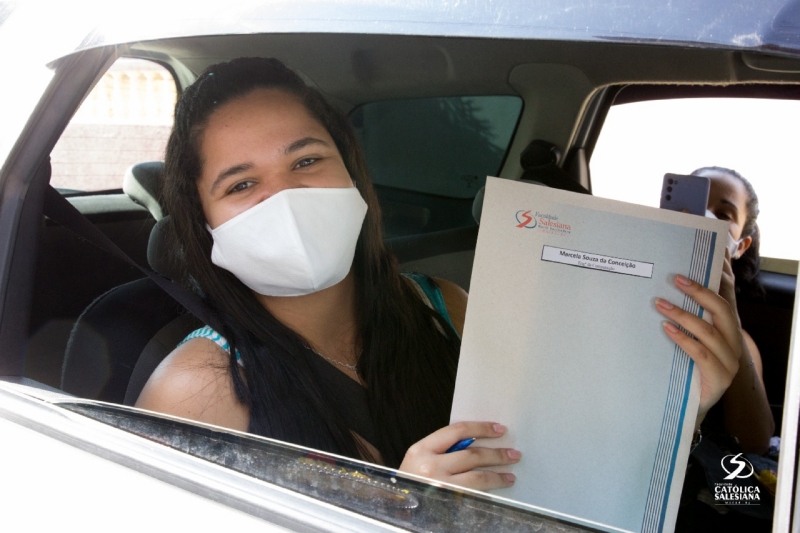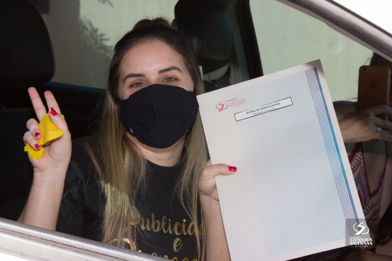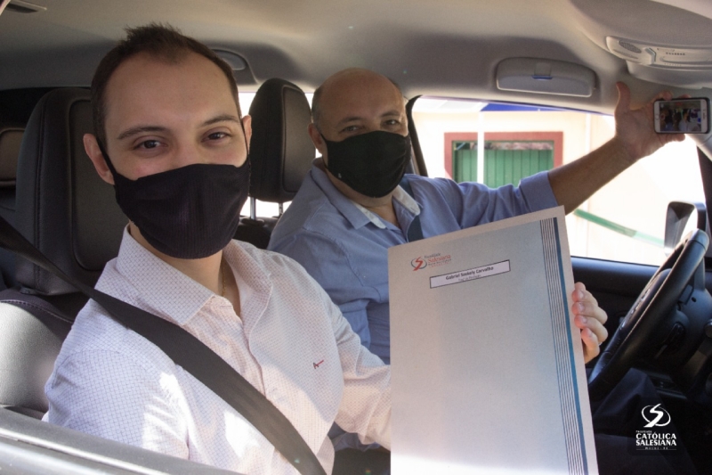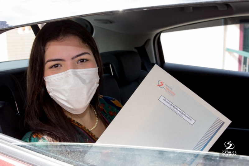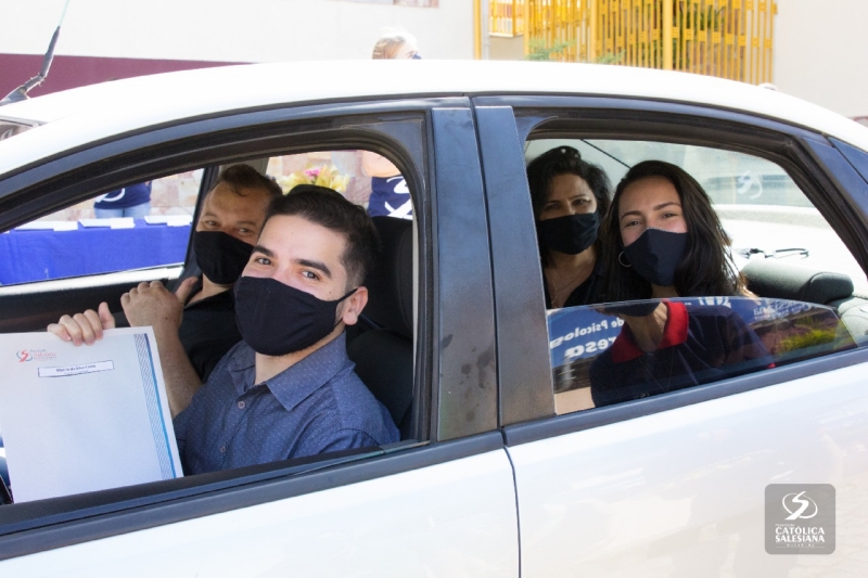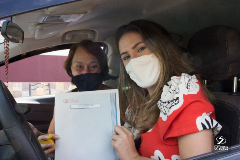 De dentro dos carros e respeitando os protocolos de higienização, os recém-graduados recebiam os documentos das mãos da diretora geral da Faculdade Salesiana, Ir. Carmelita Agrizzi e da vice-diretora acadêmica, Ana Cristina Lousada.