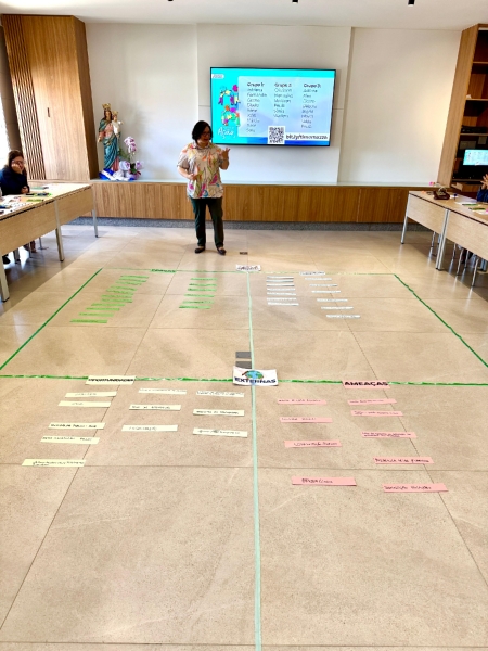 A atividade principal do encontro consistiu em um exercício de análise coletiva do cenário corporativo da Sede, utilizando a Matriz SWOT (ou “Swatch”), que permite identificar forças e fraquezas internas, além de mapear ameaças e oportunidades externas. Divididos em três grupos, os/as Colaboradores/as foram convidados/as a discutir e compartilhar suas percepções sobre a realidade atual, levantando pontos essenciais que podem orientar os próximos passos da instituição. Esse momento foi marcado por um espírito de integração e corresponsabilidade, em que Irmãs e leigos, juntos, refletiram sobre os desafios e oportunidades que se apresentam.