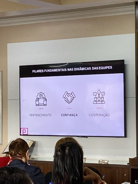 No primeiro dia, as atividades do grupo se concentraram no tema “Desenvolvimento Humano e Organizacional”, apresentado pela assessora Patrícia Lisboa, professora, palestrante, comunicóloga, psicanalista, master coach, head trainer e mentora certificada. Em sua abordagem, Patrícia ressaltou: “O que diferenciará o profissional do futuro será o seu repertório”, reforçando ao grupo a importância do pertencimento, da confiança e da cooperação, passando pelas chamadas hard skills e soft skills. Em um momento de dinâmica, propôs que, em duplas, os/as participantes refletissem sobre a pergunta: “O que temos que fazer para construir o cenário desejado?”, discutindo o que precisavam parar, continuar e começar a fazer, firmando um compromisso mútuo para avaliação futura e de curto prazo de suas ações.