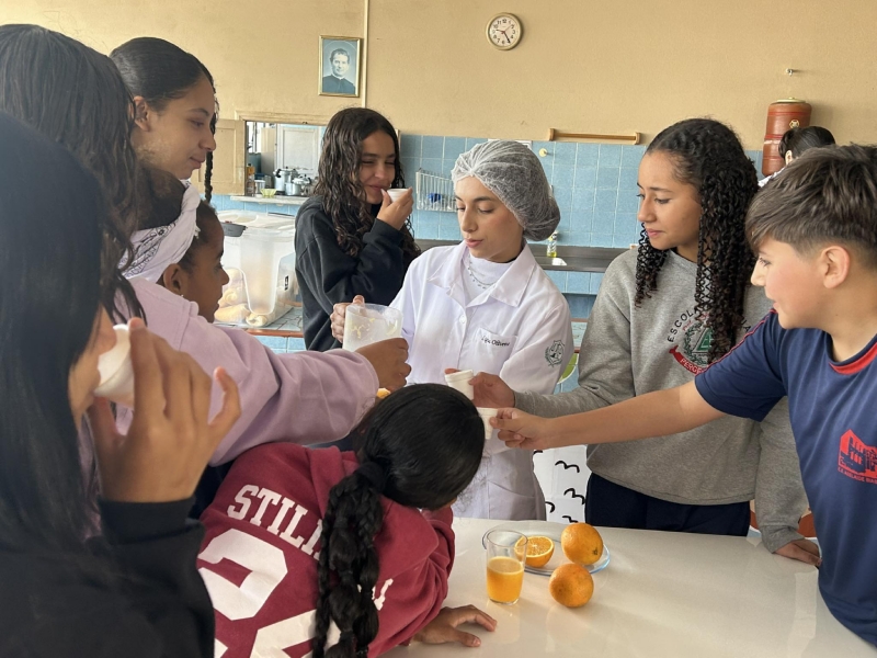 Dia 22 de outubro - Dia de Projeto de Extensão, as turmas participaram de uma experiência deliciosa e cheia de aprendizado! As crianças e adolescentes das turmas Paz e Solidariedade experimentaram suco natural e suco industrial com os olhos vendados e tentaram adivinhar qual era cada um - uma dinâmica divertida e educativa sobre sabores e escolhas saudáveis. Já as turmas Alegria e Gratidão participaram de uma atividade com cartinhas e perguntas sobre alimentação, estimulando a reflexão e o conhecimento. Para finalizar com chave de ouro, saborearam um bolo nutritivo preparado com muito carinho pelos acadêmicos de Nutrição.