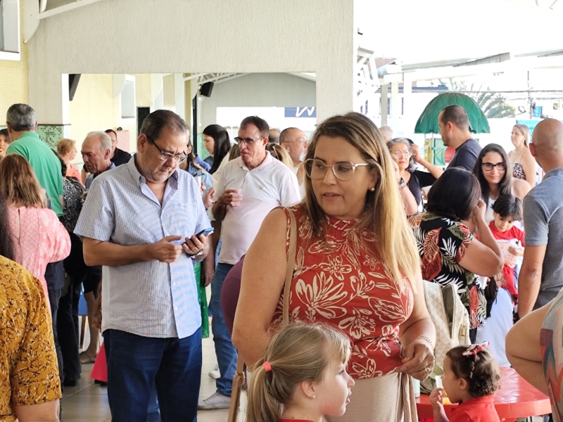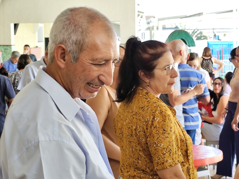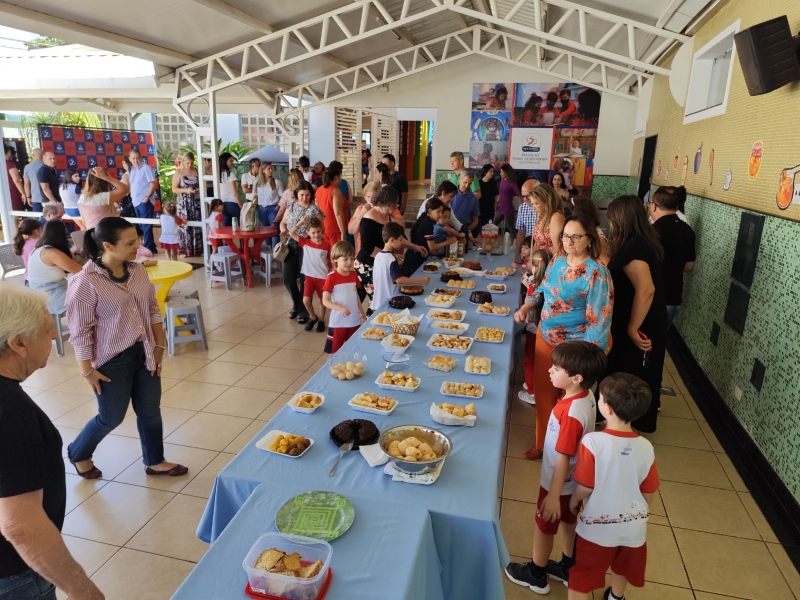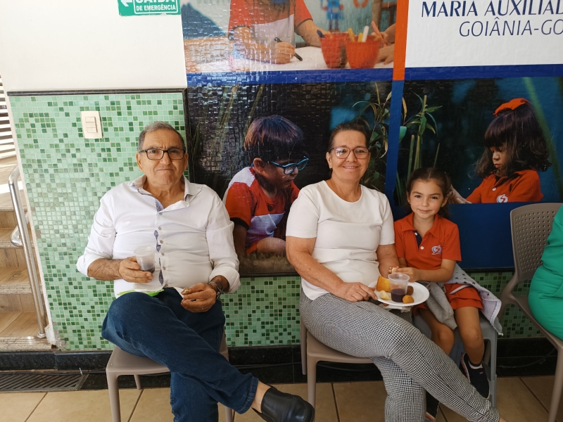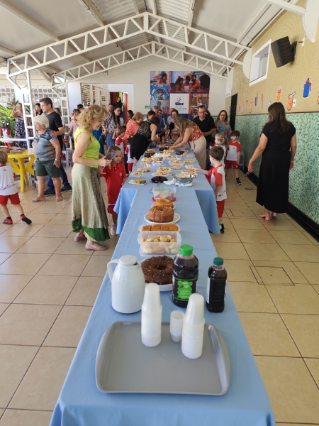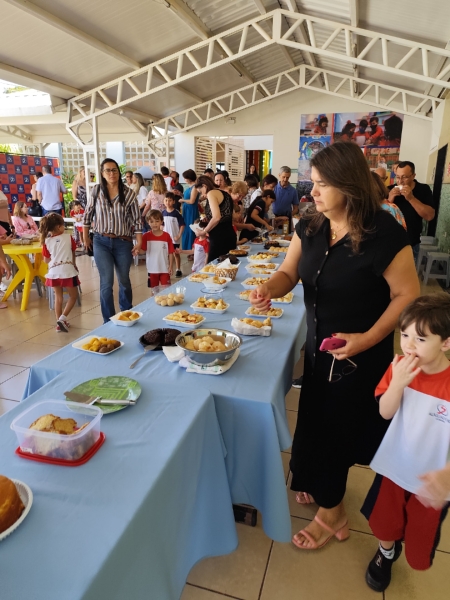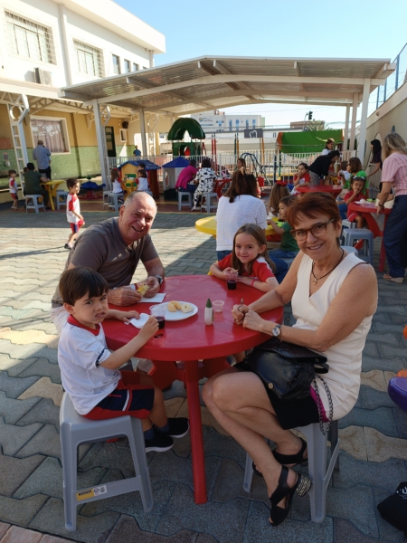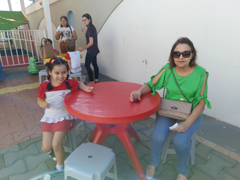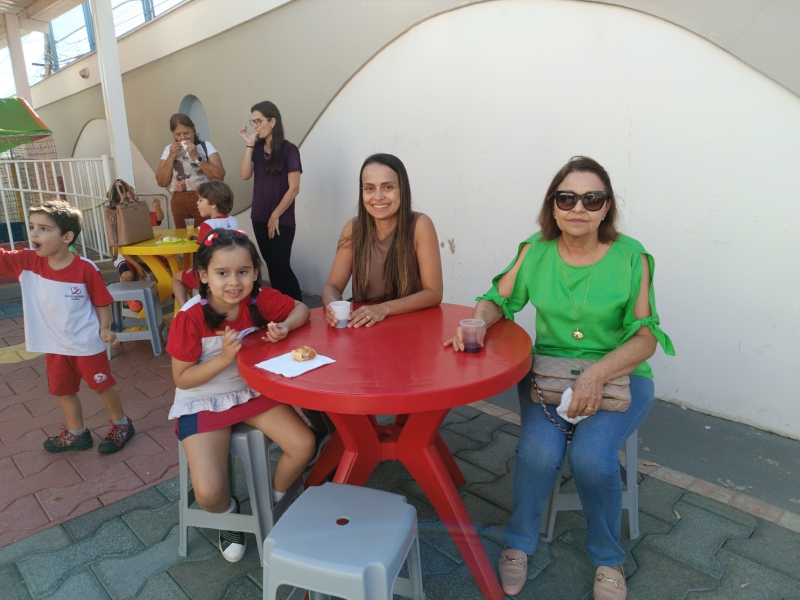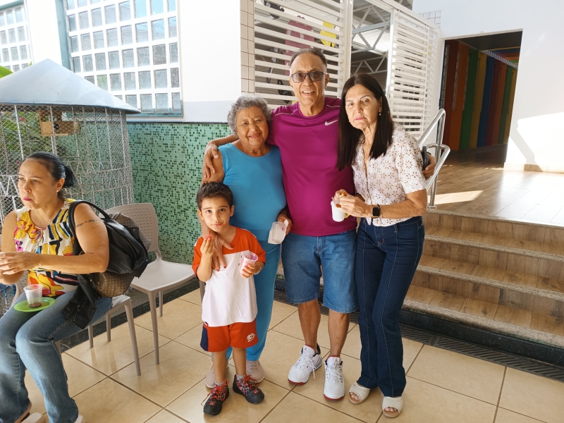 Após as apresentações, todos se reuniram no pátio da Educação Infantil para um delicioso lanche compartilhado. Seguindo a tradição de união e partilha, cada avô e avó trouxe um pratinho de salgados ou quitandas, que foram distribuídos entre os participantes. Esse momento de confraternização foi além de um simples lanche; tornou-se uma oportunidade de fortalecer laços, trocar experiências e celebrar a riqueza de convivência entre as gerações.