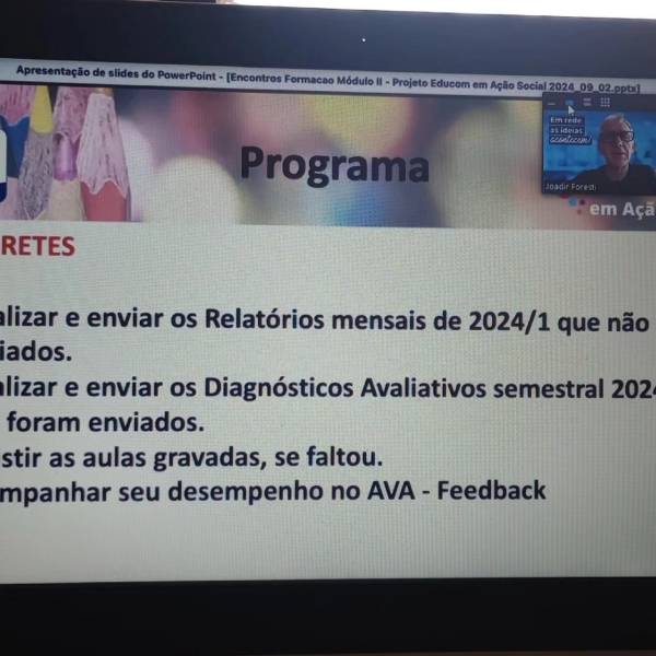 Na manhã do dia 02 de setembro segunda-feira, as educadoras Andréia e Magda participaram da 3ª aula online da Formação para o Projeto Educomunicação e Ação Social, Módulo II, com a professora Flávia Giffoni. Iniciando com os lembretes do professor Joadir a respeito dos compromissos com a entrega dos relatórios e atividades nos prazos estipulados. A professora Flávia enfatizou a dinâmica de bonificação para as entregas nas datas certas e o posicionamento no ranking do Educador Olímpico. Seguindo com uma dinâmica abordagem gamificada onde os participantes socializaram sobre os elementos da gamificação. Finalizando, abordou os tipos de jogadores a que cada participante se identifica. Salientando a gamificação também como recursos e elementos não tecnológicos, dentro da realidade de cada Obra Social. Gamificar é possível sem uso da tecnologia, encerrando assim uma manhã de expectativas e aprendizado.
