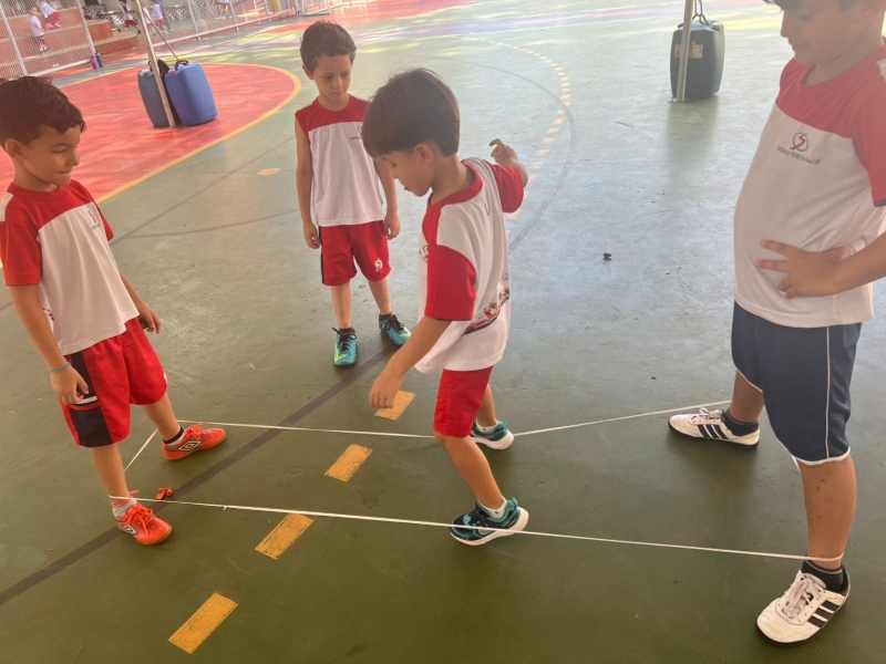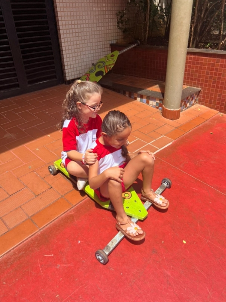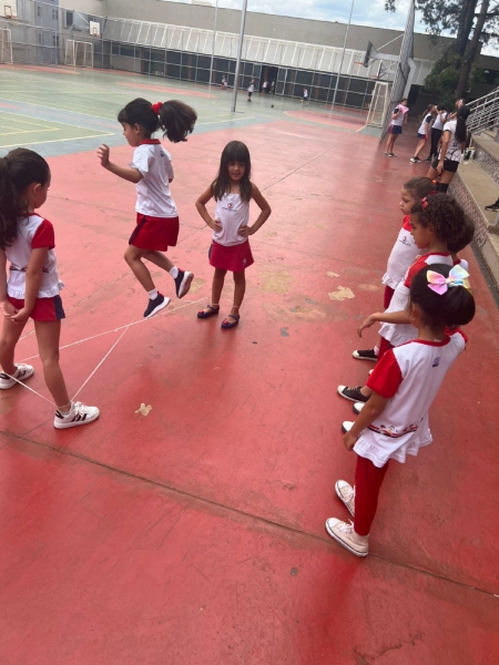 Nas últimas semanas, quem passa pelo pátio da nossa escola percebe uma cena diferente: propostas variadas nas aulas de Movimento. Isso porque as crianças estão redescobrindo brincadeiras antigas como pular elástico, jogar bolinha de gude e até andar de carrinho de rolimã, tudo com muita alegria e participação.