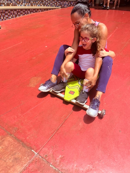 O elástico, por exemplo, virou a alegria das crianças. Entre um salto e outro, elas criam regras, inventam passos e ajudam umas às outras. A atividade parece simples, mas trabalha coordenação, ritmo e até a convivência em grupo. A bolinha de gude também tem feito sucesso. Muitas crianças nunca tinham brincado e ficam encantadas ao aprender a mirar, calcular distâncias e pensar estratégias para vencer o jogo. O que parece apenas diversão acaba desenvolvendo atenção e concentração. E o carrinho de rolimã? Esse virou o favorito da criançada. Com versões adaptadas para garantir segurança, as crianças se revezam nas descidas e aprendem sobre equilíbrio, coragem e até trabalho em equipe. As risadas não faltam!