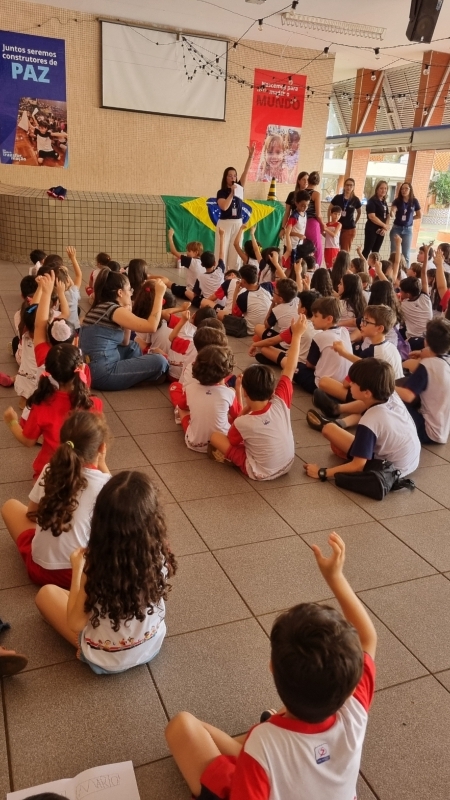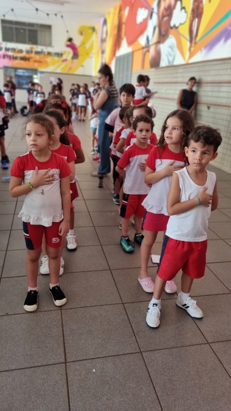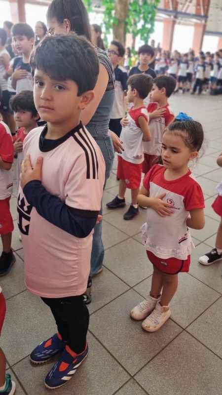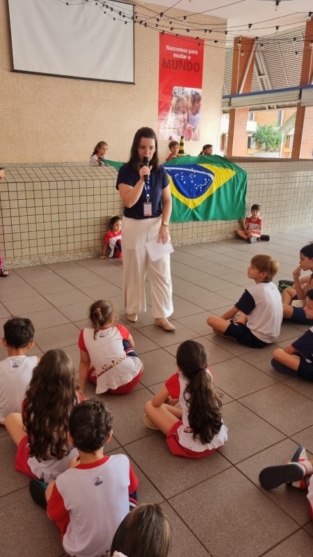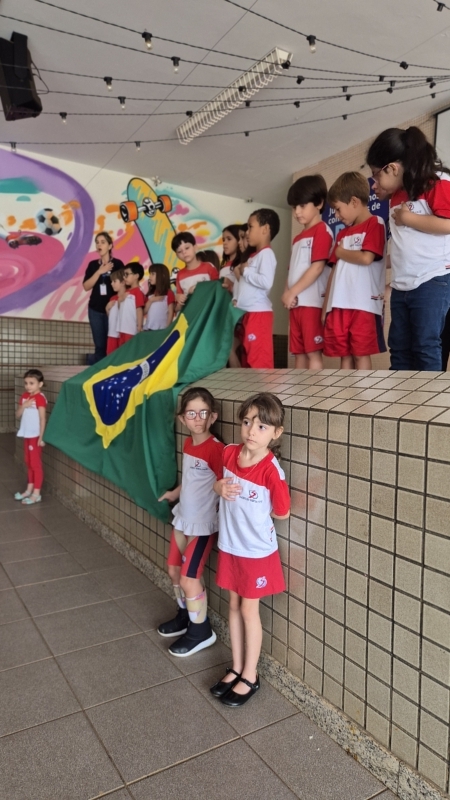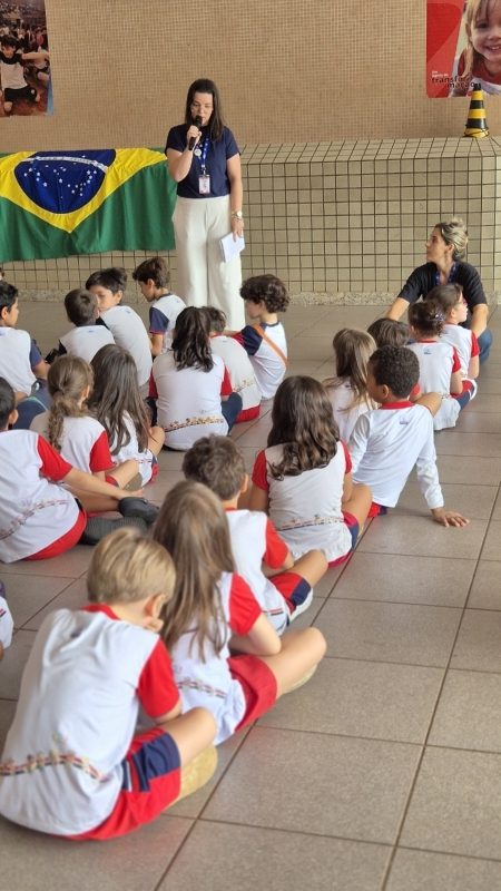 E no Fundamental I, esse momento ganhou um encanto ainda maior. A acolhida da Bandeira contou com a presença especial das crianças do Infantil 3, que em breve iniciarão o 1º ano. Elas foram recebidas com ternura pelos estudantes do segmento, compartilharam o Hino Nacional, permaneceram ao lado da Bandeira em sinal de respeito e descobriram, aos poucos, o sabor desse novo mundo que está chegando. Foi uma alegria ver cada olhar brilhando diante das conquistas que começam a florescer.