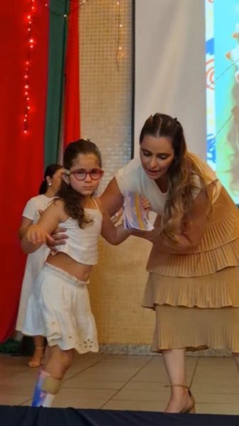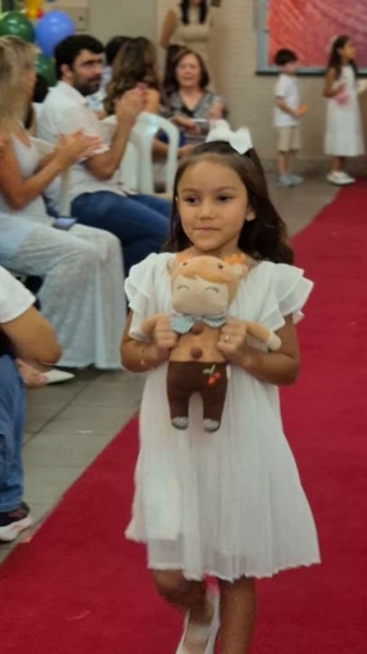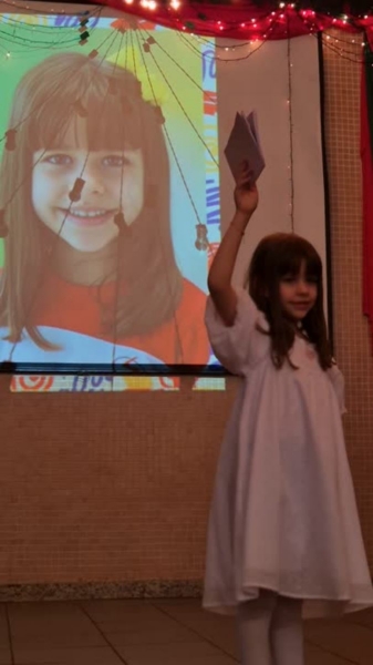 Dando sequência ao momento, as crianças cantaram a música em inglês This Little Light of Mine, que trouxe a mensagem de deixar a luz de Jesus brilhar em cada um de nós. Em seguida, vivenciamos um dos momentos mais simbólicos da noite com a música Sem Perceber, escolhida para representar o tempo que passa, transforma e nos prepara para novos voos. Na sequência, cada criança recebeu seu Caderno de Memórias do Infantil, sendo acolhida pelos aplausos, gestos de orgulho e abraços de suas famílias.