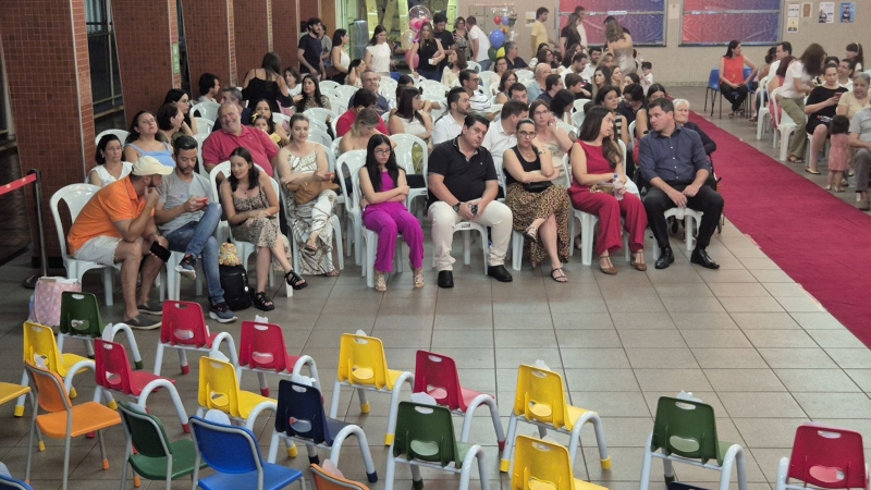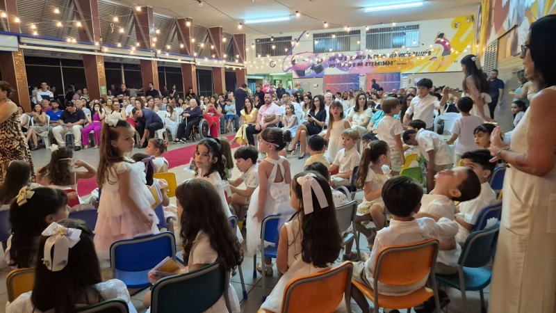 Assistimos juntos a um vídeo preparado com carinho, que retratava a passagem de um prédio para o outro, mostrando o apoio e o cuidado de toda a equipe, professoras, coordenação e crianças. Tivemos também a palavra da diretora pedagógica, Ana Paula Gerino, que trouxe uma reflexão sobre esse período tão importante na vida das crianças, que é a Educação Infantil. A diretora institucional, Irmã Rosa Idalia, falou sobre a bênção que é acompanhar cada etapa da vida dos filhos e, logo após, conduziu um momento especial de oração, no qual as famílias puderam abençoar seus filhos.