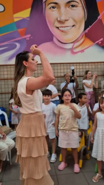Em um momento especial, ouvimos palavras que nos lembravam que a infância é feita de começos e recomeços: crianças que dançam com as cores, atravessam histórias, inventam mundos, exploram letras, palavras e textos; crianças que crescem por dentro e por fora, porque educação é coisa do coração, como dizia Dom Bosco.